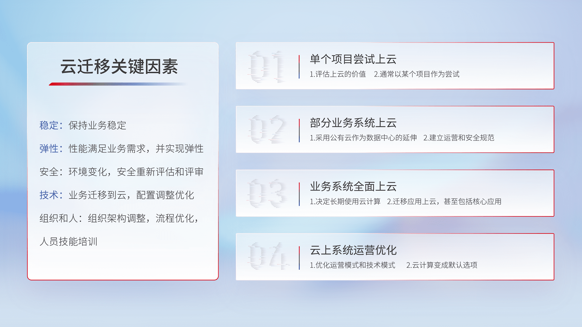 结合实际业务,,从规划设计、、云平台选型、、、云原生改造、、、、数据迁移、、、、集成交付,,,,迁移全过程为客户识别最佳上云路径,,,,做好风险识别管理,,设计网络架构、、、身份权限、、安全审计合规、、、、操作审计、、、日志审计、、、、监控告警策略、、、、多站点容灾设计等,,对云上基础设施进行整体规划,,提升IT治理水平,,,,以满足弹性、、高可用、、、高性能的需求。。